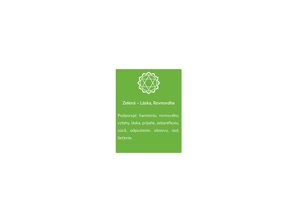 Zelená prináša mier. Je to farba života a prírody a predstavuje rast, sviežosť, rovnováhu, prostredie a peniaze. Tiež podporuje silnú emocionálnu korešpondenciu s bezpečnosťou. Táto farba podporuje celkovú pohodu, vnútornú harmóniu a uľahčuje uvoľnenie myslenia a svalov. Zelená symbolizuje srdcovú čakru čo je centrum lásky a seba-lásky.